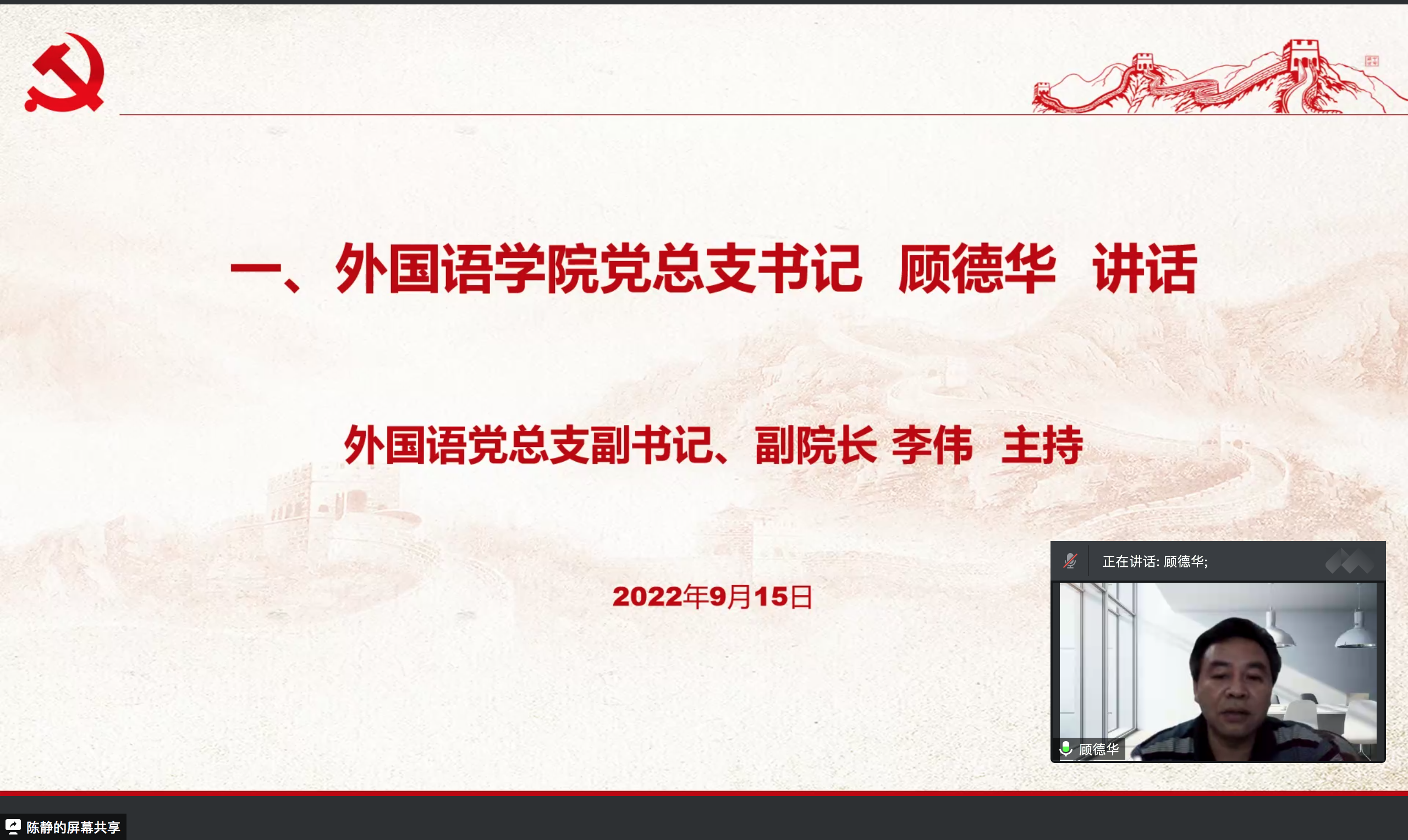 9月15日,外国语学院2022级新生入党启蒙教育活动顺利开展,活动由外国语学院党总支书记顾德华,外国语学院总支副书记、副院长李伟,组织员陈静,辅导员冯晨音出席,外国语学院全体2022级新生参加。