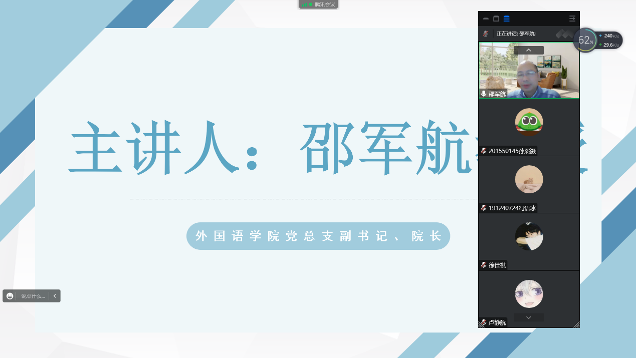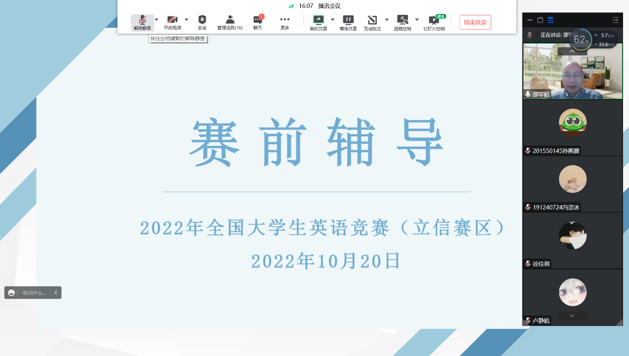 为助力学科竞赛发展,帮助我校参加2022年全国大学生英语竞赛决赛学生赛出好成绩,2022年10月20日,我院举办的“2022年全国大学生英语竞赛(决赛)考前辅导”通过腾讯会议室顺利举行。本次考前辅导由我院院长邵军航教授主讲,参赛选手全员参加。