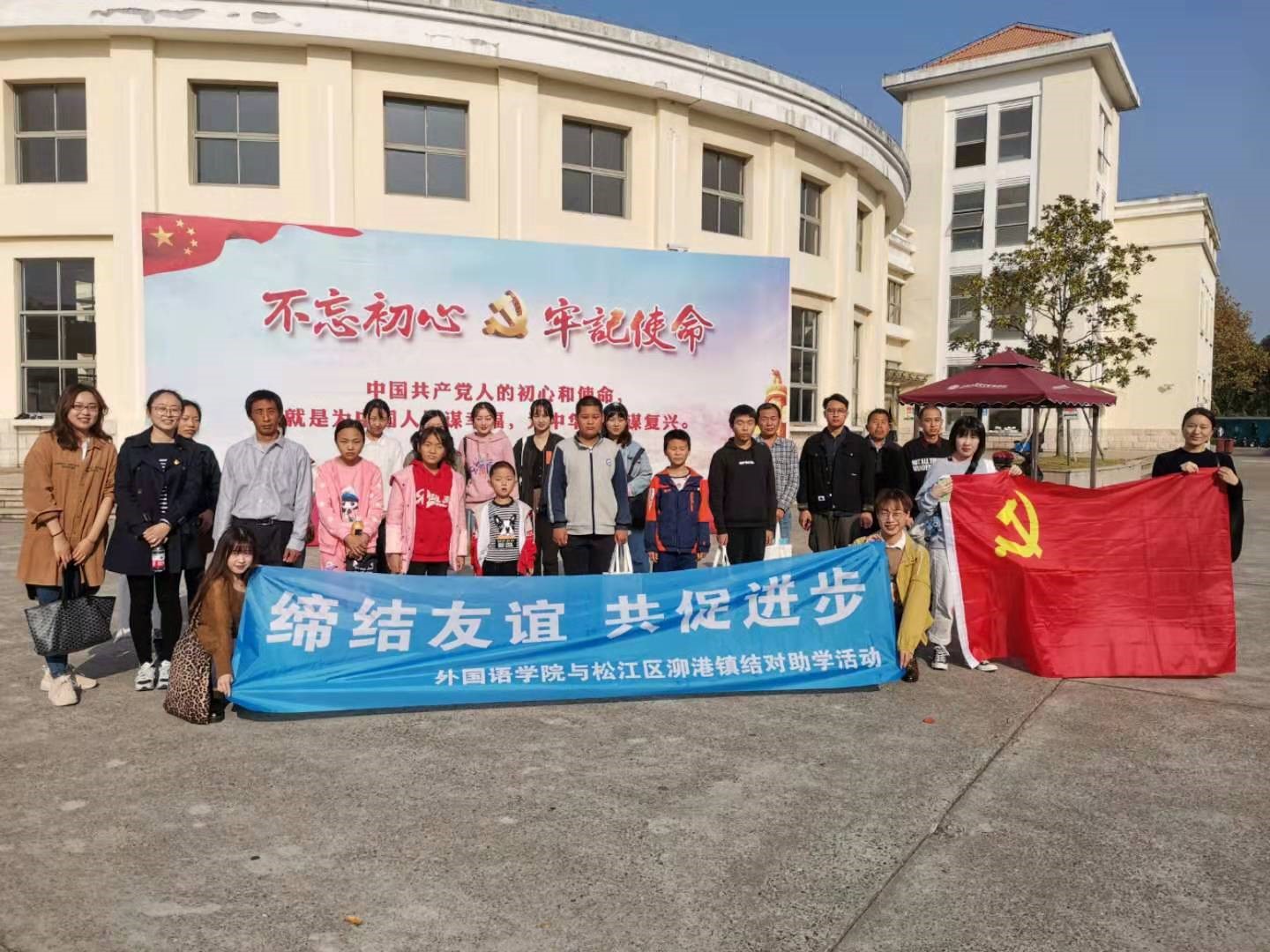 上海立信会计金融学院外国语学院与松江区泖港镇结对助学活动开始于2015年,每年都会组织学生党员和学生骨干以举办爱心暑托班、英语补习辅导、筹集发放慰问金和物品、“一对一”爱心结对传递助学等多种形式,以实际行动对泖港镇特困特殊情况中学学生进行力所能及的实质性资助帮扶,对于帮助受助中小学生增强克服困难信心和勇气,开拓思维眼界,提高学习成绩,建树努力学习、励志成才的进取心,发挥了有价值的积极作用,受到泖港镇党委政府、特困特殊家庭和社会多方面好评和表彰。仅爱心暑托班,就被松江区文明办立为“精神文明建设基金资助项目”,并先后有2名学生荣获“上海市突出贡献志愿者”(或“上海市优秀志愿者”)、4名学生荣获“松江区最具活力志愿者”(或“松江区优秀志愿者”)和1名教师荣获“松江区志愿服务优秀组织者”称号。