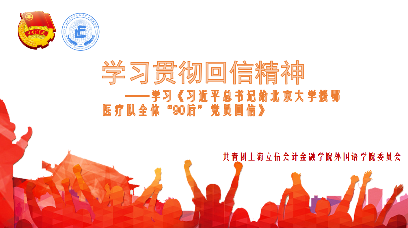 为深入学习《习近平总书记给北京大学援鄂医疗队全体“90后”党员回信》精神,将《回信》精神与习近平新时代中国特色社会主义思想和党的十九届四中全会精神紧密结合,做好疫情防控期间团员青年的思想引领工作。近日,外国语学院团委组织团学干部、团员学生开展了“云团课”,学习习近平总书记《回信》精神。