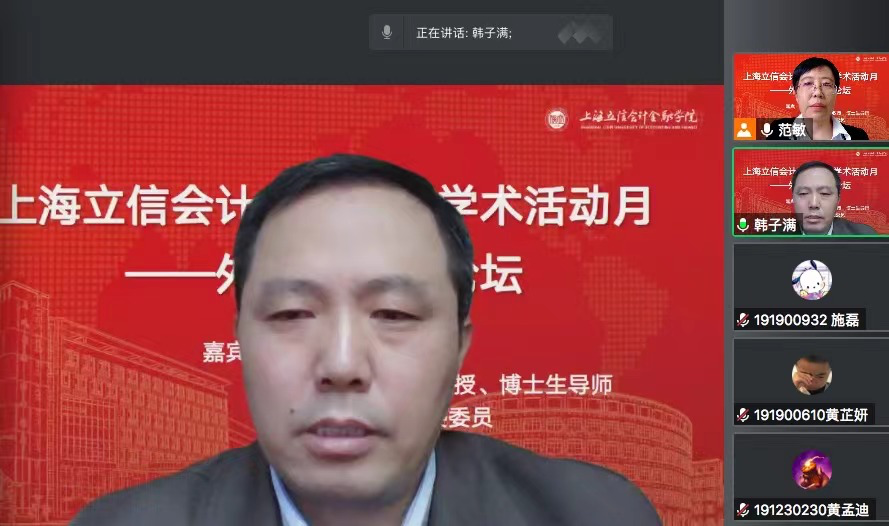 2022年11月2日下午,上海外国语大学博士生导师韩子满教授应邀为外国语学院师生做了题为“中国文化术语外译的解释性与术语性——以‘太极拳’为例”的学术报告。此次报告是上海立信会计金融学院第二届学术活动月系列学术活动之一。报告由外国语学院范敏教授主持。
