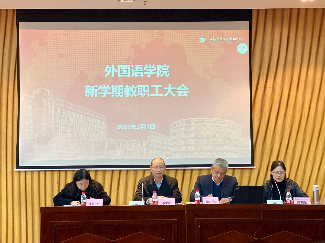 2023年3月1日下午,外国语学院召开新学期教职工大会,除党总支书记顾德华同志等因参加校双代会而缺席外,学院领导班子其他成员和教职工参加了会议,会议由党总支副书记、院长邵军航同志主持。