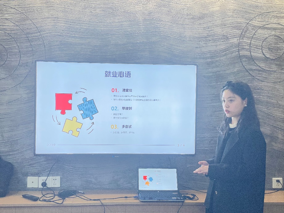 刘叶诚从简历撰写、简历投递、面试经历、签约过程四个方面向大家分享了自己的求职经历。在简历撰写上,以自己的简历为例,强调简历需要清晰明了、突出重点、真实诚信。建议适当采用数据来量化、具体化自己在大学期间或实习期间取得的成果;在简历投递上,向同学们推荐了一些可靠的求职相关信息的网站和公众号。同时强调在等待投递结果的过程中,一定要准备好自我介绍,梳理自己的经历,为面试做好准备。最后她希望同学们能把握住各种实习、求职的机会,多尝试,积累经验。