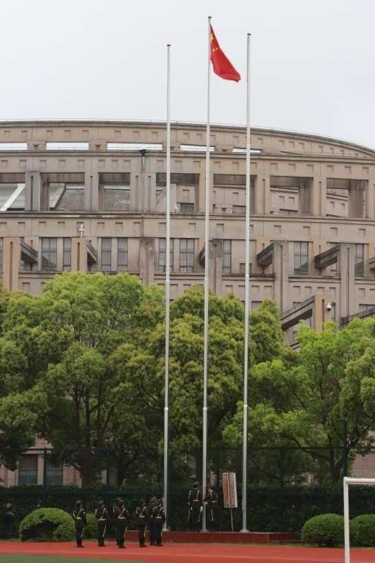 春风拂面,雨后的空气格外清新,国旗班带着蓬勃的朝气,迈着整齐有力的步伐,目光坚定、神情肃穆地护卫国旗入场。庄严的国歌声响起,随风飘扬的五星红旗徐徐上升,全场人员庄严肃立,齐唱国歌,并以崇高的敬意向国旗行注目礼。