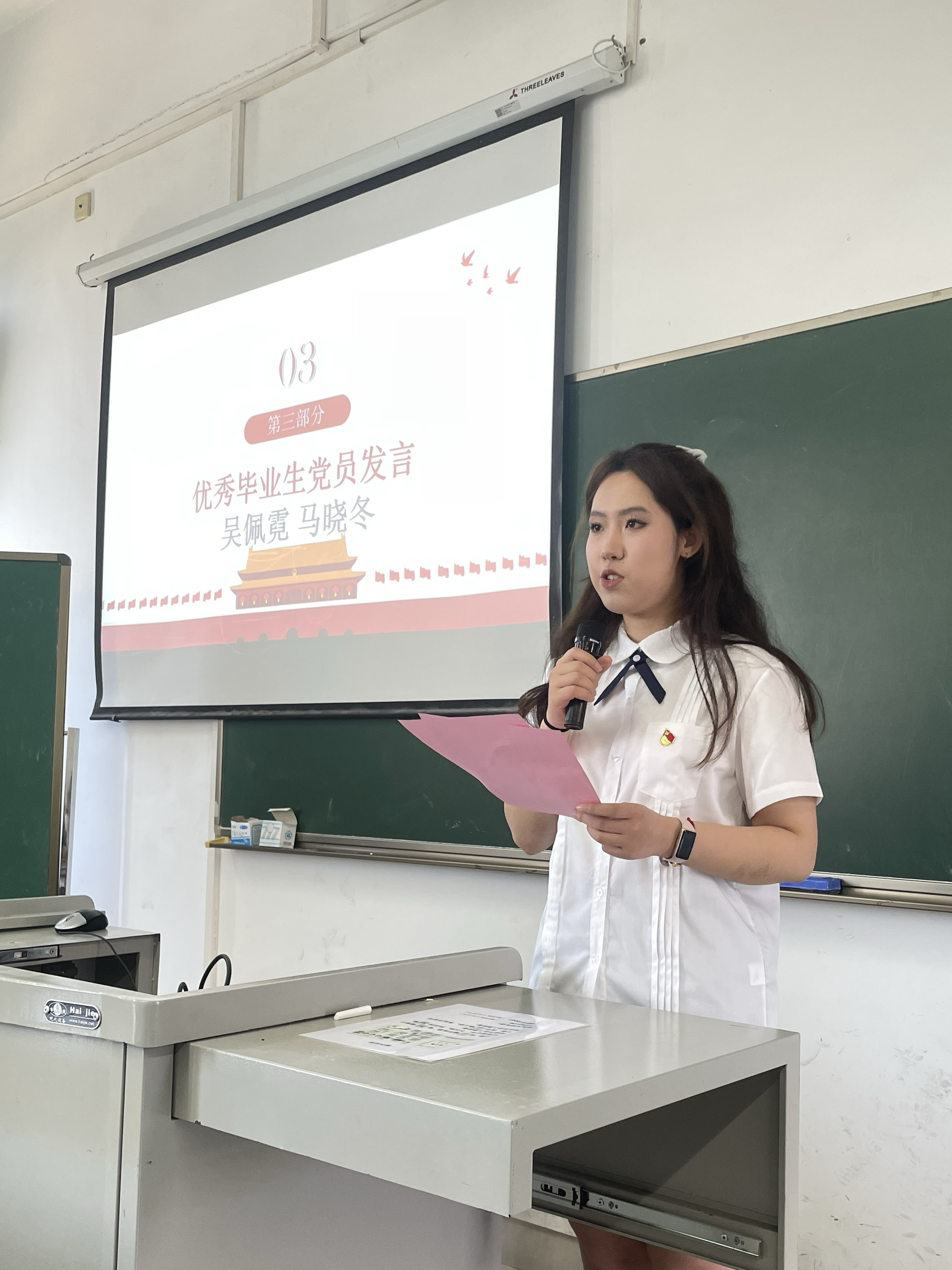 接着,2位优秀毕业生党员代表进行发言。吴佩霓同志鼓励学弟学妹们积极主动去争取展示从而获得沉淀。面对喜欢的专业领域、行业、心仪的offer,积极做准备。号召大家以全心全意为人民服务为宗旨,发挥党员先锋模范作用,要在活动中以服务他人、奉献社会为己任。