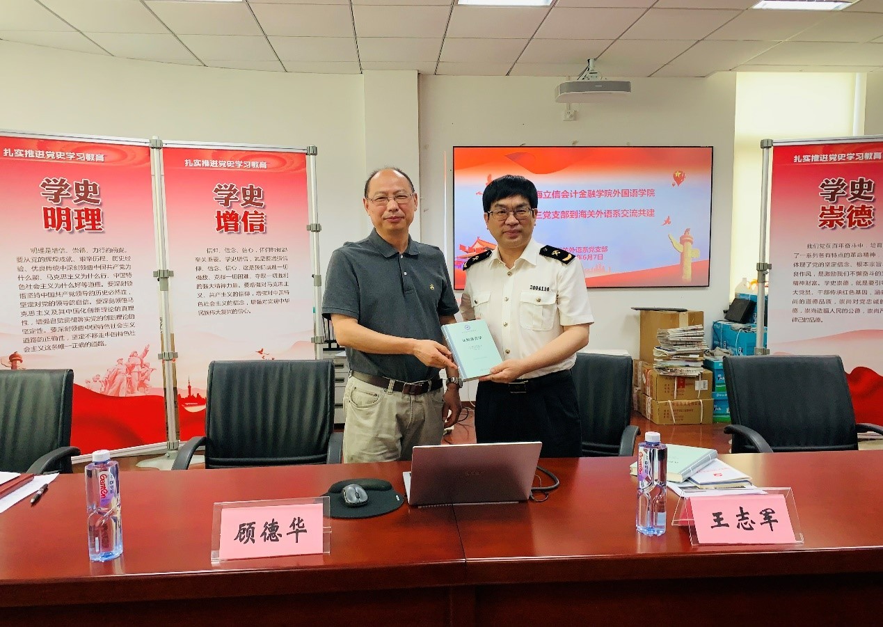 在共建签约仪式上,顾德华书记提出两个党支部应“共强”党建、“共享”资源,“共育”项目,党建互学,党建与业务相融合,发挥各自特色,互联深化,进行党建品牌建设。邵军航院长强调应以党建为抓手,为外国语学院硕士点建设做出贡献。上海海关学院海关外语系的王志军书记从党支部成员构成,总署廉法工作,以党建为引领,发展学科建设等多个方面对作为“党建品牌支部”——海关总署“树人先锋”培育单位,进行支部建设工作的介绍。外国语学院教师第三党支部孙艳老师对本支部作为上海立信会计金融学院的“样板党支部”培育单位的建设情况介绍。两个党支部还进一步交流了工作和学习等情况,顾德华书记和王志军书记共同签署了共建协议,互赠了结对党支部的标牌,邵军航院长向王志军书记赠送书籍。