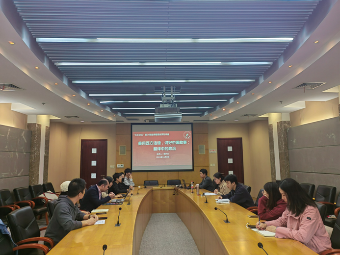 2024年11月8日,上海海关学院外语系副主任、副教授胡兴文,为我院师生作了题为“善用西方话语,讲好中国故事:翻译中的政治”的学术讲座。本次讲座也是我院课程思政系列活动之一。讲座由外国语学院副院长高莉敏主持。