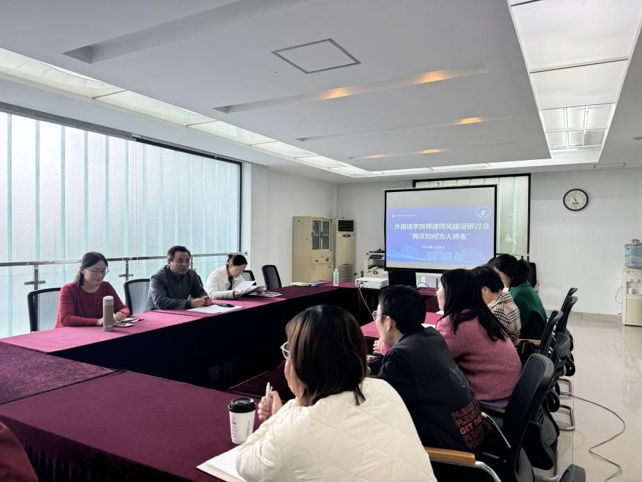 为积极贯彻学校“2024年师德师风建设年”的工作部署,外国语学院于12月4日下午,举办了师德师风建设研讨会。本次会议以“我该如何为人师表”为主题,旨在通过交流与研讨的方式,进一步明确教师的职责,提升教师的职业道德素养。会议由学院党总支书记顾德华主持,学院领导班子成员及部分教师参加了此次会议。