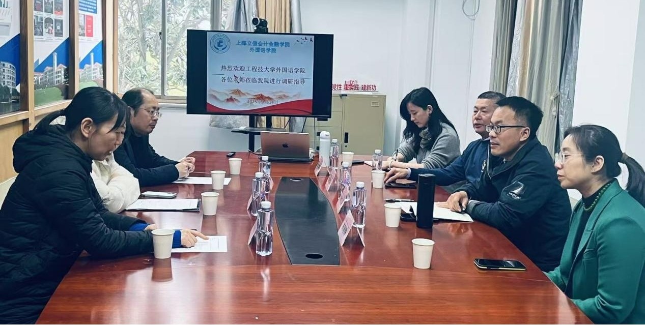 2025年3月14日,上海工程技术大学外国语学院应用外语教学部调研团队来我院进行调研交流。此次调研旨在加强两院间的合作与交流,共同探索外语教育教学的发展路径,也是外国语学院教师第一党支部与上海工程技术大学数理外国语学院联合党委教工第四党支部之间的联合党建活动。