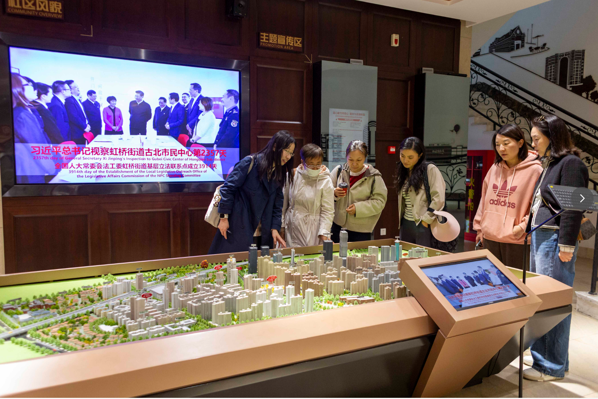 在展示大厅,党员教师们驻足在习近平总书记视察古北市民中心主题屏幕前,参观古北地区建筑雕塑模型与规划沙盘,通过微缩景观与实景介绍,全面了解古北国际社区从规划建设到治理发展的历程,直观感受上海超大城市基层治理中“人民城市人民建、人民城市为人民”的生动实践,体会基层工作如何以群众需求为导向,打造宜居、融合、有序的国际社区。