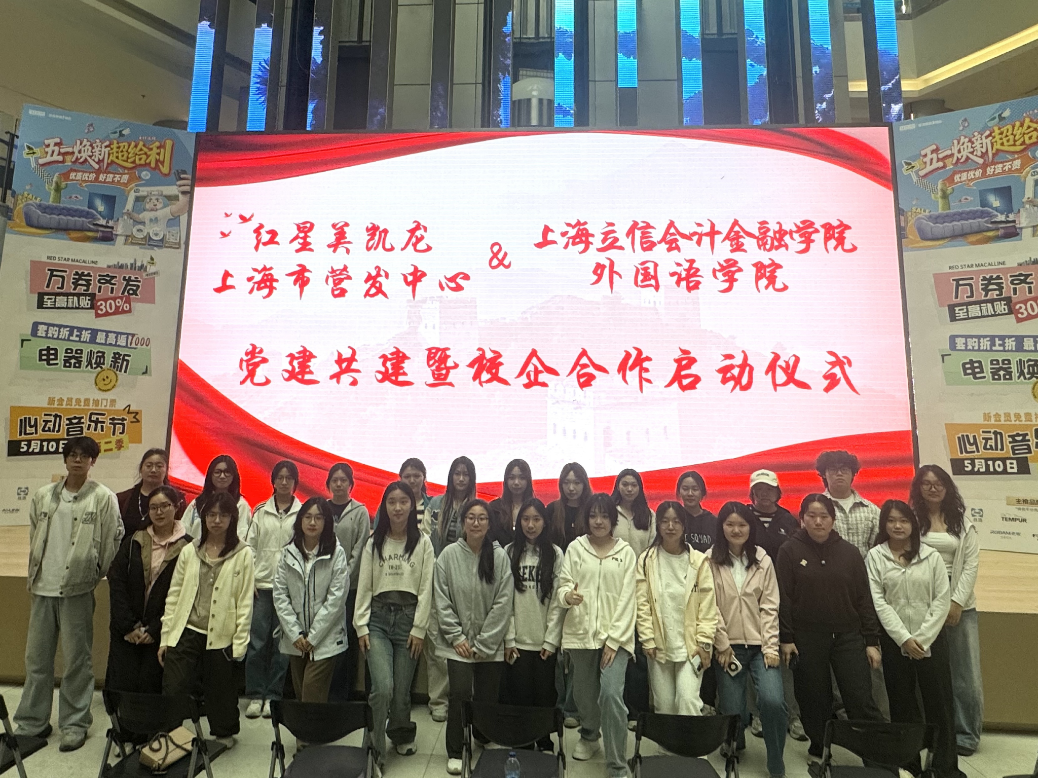 2026年4月24日,外国语学院与建发集团美凯龙(上海)党建共建暨校企合作启动仪式在红星美凯龙上海全球家居1号店顺利举行。双方以党建为引领、以育人为目标,正式开启产教融合、资源共享、人才共育、互利共赢的新篇章。红星美凯龙上海党委副书记胡云霞,团委书记顾莺,营发中心财务部长王延芳,人力资源部经理王梦艺、刘文娟,校招负责人郑伊健等企业代表;外国语学院党总支副书记、院长邵军航,副院长韩玫、高莉敏及师生代表共同出席本次活动。