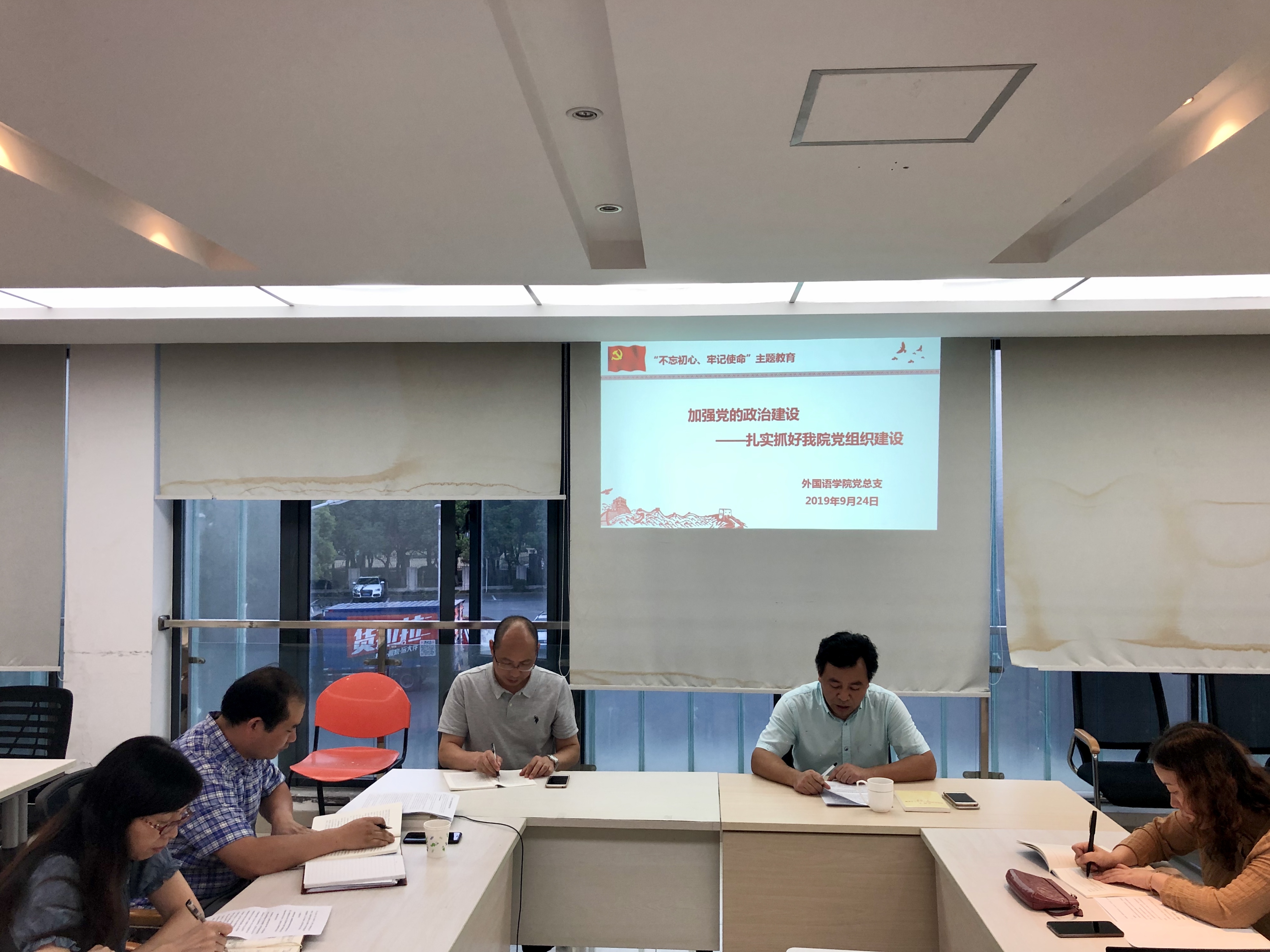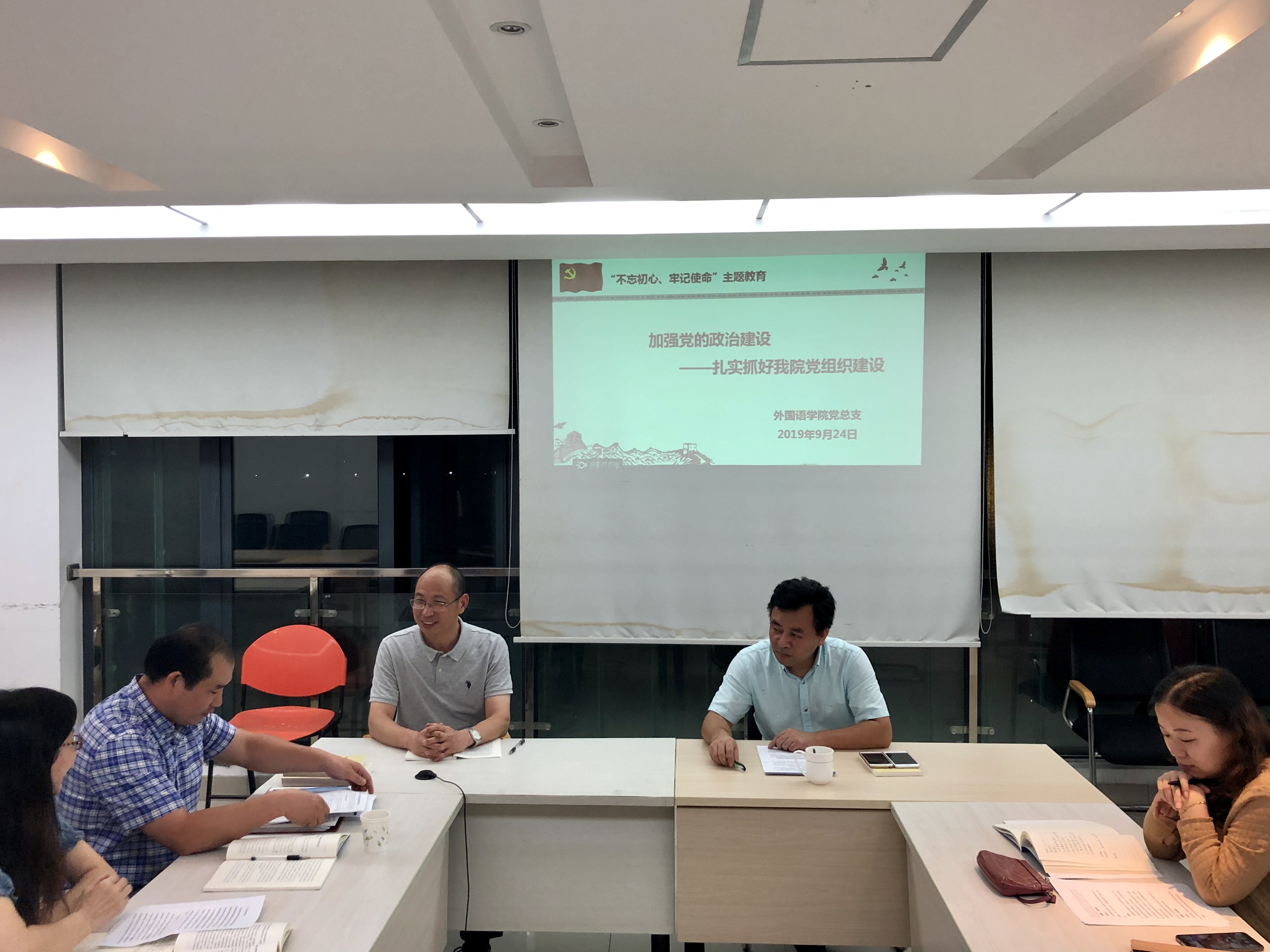 9月24日傍晚,外国语学院党政领导举行“不忘初心、牢记使命”主题教育集中学习研讨,研讨主题为“加强党的政治建设——扎实抓好我院党组织建设”。