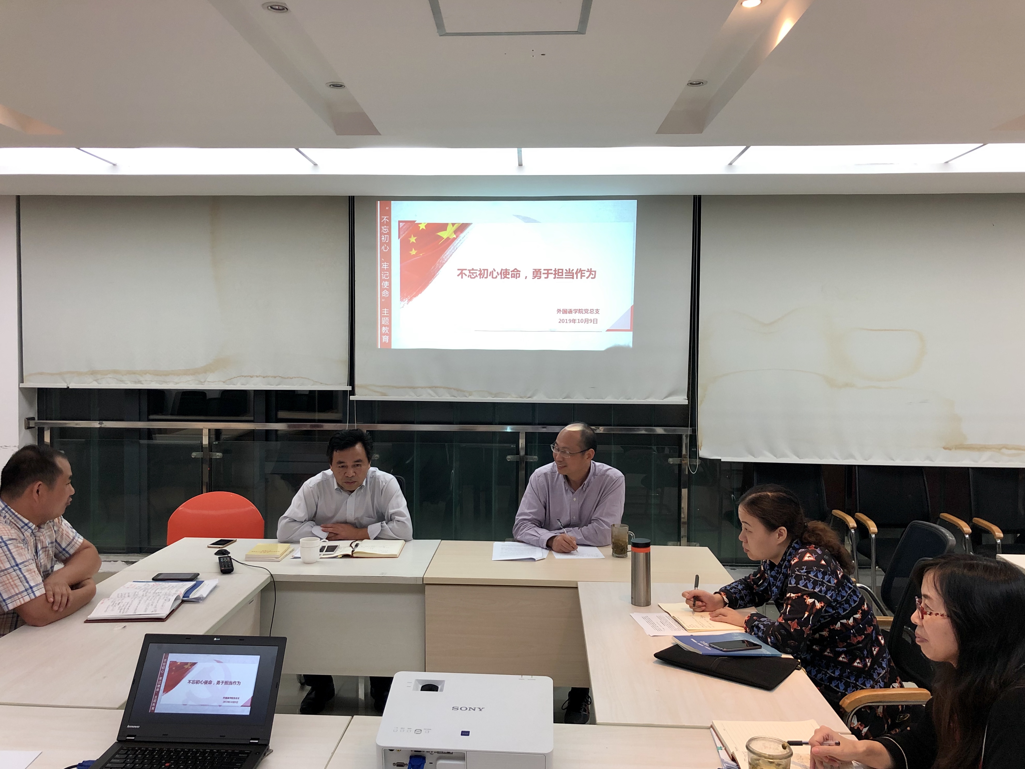 10月9日傍晚,外国语学院党政领导班子举行“不忘初心、牢记使命”主题教育第二次集中学习研讨,研讨主题为“不忘初心使命,勇于担当作为”。本次集中学习研讨由学院党总支副书记、主持行政工作副院长邵军航作主题发言,其他班子成员作交流发言。