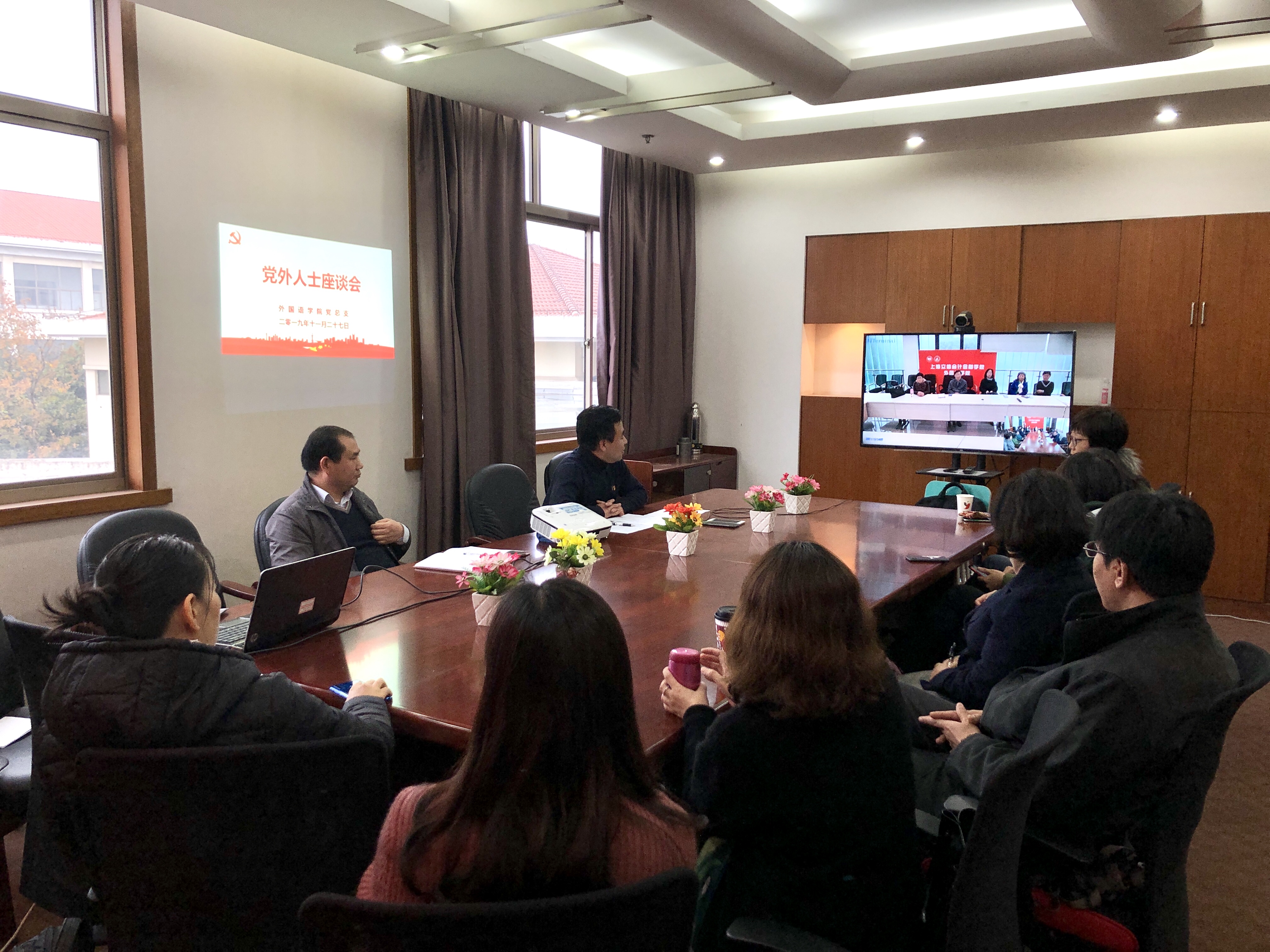 11月27日下午,外国语学院党总支举行民主党派教师座谈会。学院党总支书记顾德华主持会议,党总支副书记、主持行政工作副院长邵军航、党总支副书记、副院长高永祥参加座谈会。座谈会以浦东、松江两校区视频形式举行。 座谈会上,顾德华同志首先向民主党派教师通报学院党总支开展“不忘初心、牢记使命”主题教育情况,以及通过主题教育,党总支、各党支部、全体共产党员所取得的收获与成效,通报了党总支下一阶段的主要工作;然后,顾德华同志就学院党政领导班子成员与民主党派教师开展交友、结对子工作,建立交流沟通机制进行了部署介绍。邵军航同志就学院近期主要工作情况进行通报,明确学院下一步工作开展的方向和目标。