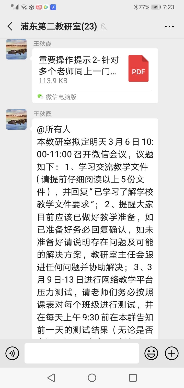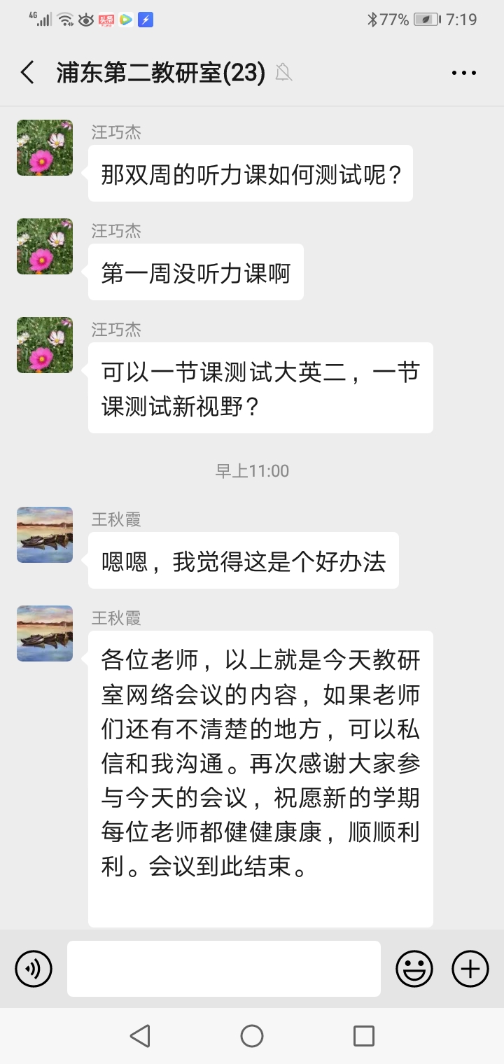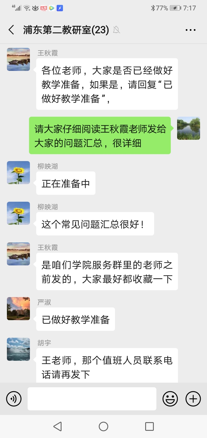 为确保疫情防控期间我院网络教学工作顺利开展,2020年3月6日上午,外国语学院大学英语教研室通过微信群召开了新学期“网络教学准备工作”会议,副院长邵军航(主持工作)以及教研室全体教师参加了会议。 本次会议围绕新学期网络教学准备工作展开,大学英语教研室主任蔡激扬和王秋霞对《疫情防控期间的教学工作提示》、《外国语学院网络教学工作应急预案》等文件进行了解读,对重点内容逐个梳理和强调,确保每位教师按照文件精神和要求认真落实到位;教研室老师对前期网络教学准备过程中出现的问题进行了充分交流,并逐一提出了解决方案。邵军航副院长要求所有老师高度重视网络教学工作并做好充分准备,要按照学校要求认真完成各门课程的压力测试,及时汇报和处理测试过程中遇到的各类问题,确保大学英语网络教学任务能够顺利落实。