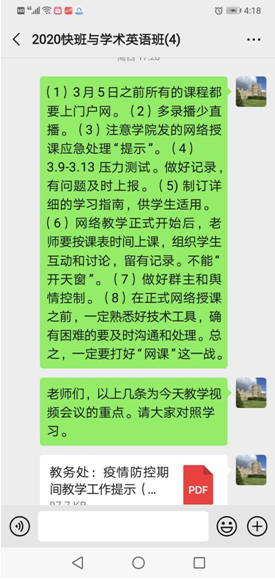 为了确保疫情防控期间大学英语网络教学工作平稳有序地开展,大学英语教学部第三教研室和第四教研室分别于3月5日和6日,通过课程组微信群,向老师们传达了学院教学会议精神。第三教研室主任陆艳和第四教研室主任王佳鸣分别与各自教研室的老师进行一对一沟通,了解具体情况,就网络教学备课过程中遇到的问题进行解答。 3月7日,两个教研室又分别组织了网络教学实训活动。第三教研室通过教师微信群开展了“学习通”平台测试活动,第四教研室在“学习通”平台上组织了线上模拟教学活动。在实训过程中,老师们分别以教师和学生的身份通过电脑端和手机端对平台中的各大功能进行检测,发现问题及时交流、互助解决。