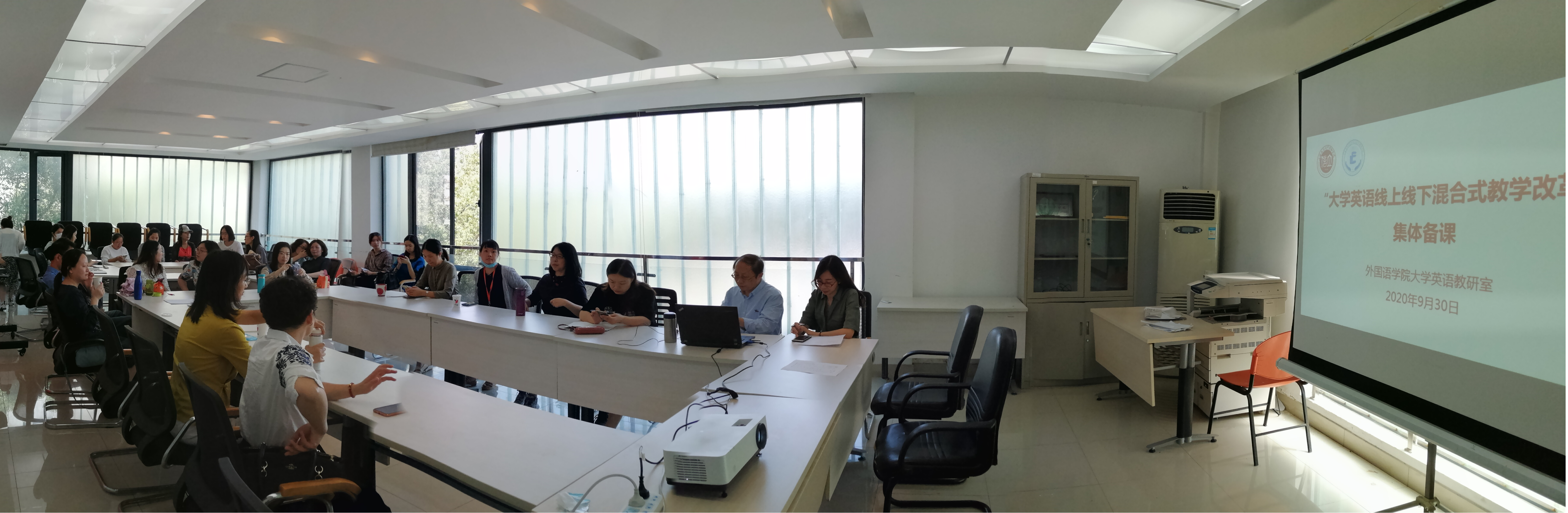 为全面实施大学英语线上线下混合式教学改革,近日,外国语学院组织大学英语教研室全体教师分别在浦东、松江两校区开展了集体备课教研活动,外国语学院副院长(主持工作)邵军航、副院长李小坤、副院长韩玫出席了此次活动。集体备课由大学英语教学部主任蔡激扬老师主持。