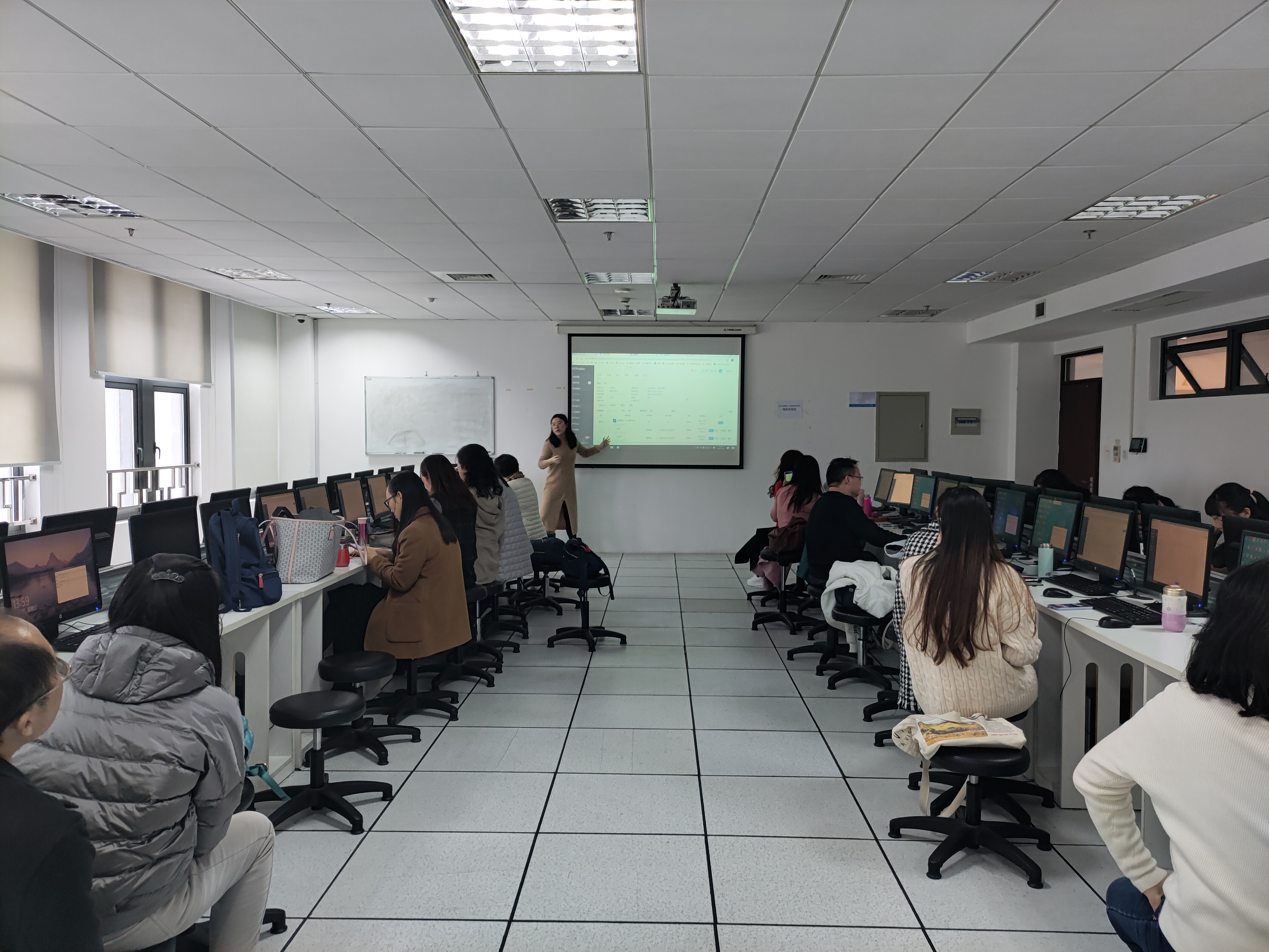 讲座后半程在实践中进行,老师们连接校园网,进入YiCAT智能翻译教学管理平台,建立账号和翻译项目,熟悉项目管理、语言资产、语料对齐和团队管理等翻译管理流程,并尝试创建个人翻译记忆库和术语库、在平台上进行实时翻译互动。