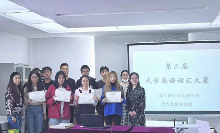 2020年11月18日下午,由外国语学院承办的上海立信会计金融学院第三届大学英语词汇竞赛复赛在松江和浦东两校区同时举行,从初赛选拔中脱颖而出的22名同学参加了本次复赛,经过激烈角逐,朱其乐、杨佳俊同学获学术英语班一等奖,戴菲娅、房景宇同学获英语快班一等奖,金皓然、陈芝宇同学获英语普通班一等奖。