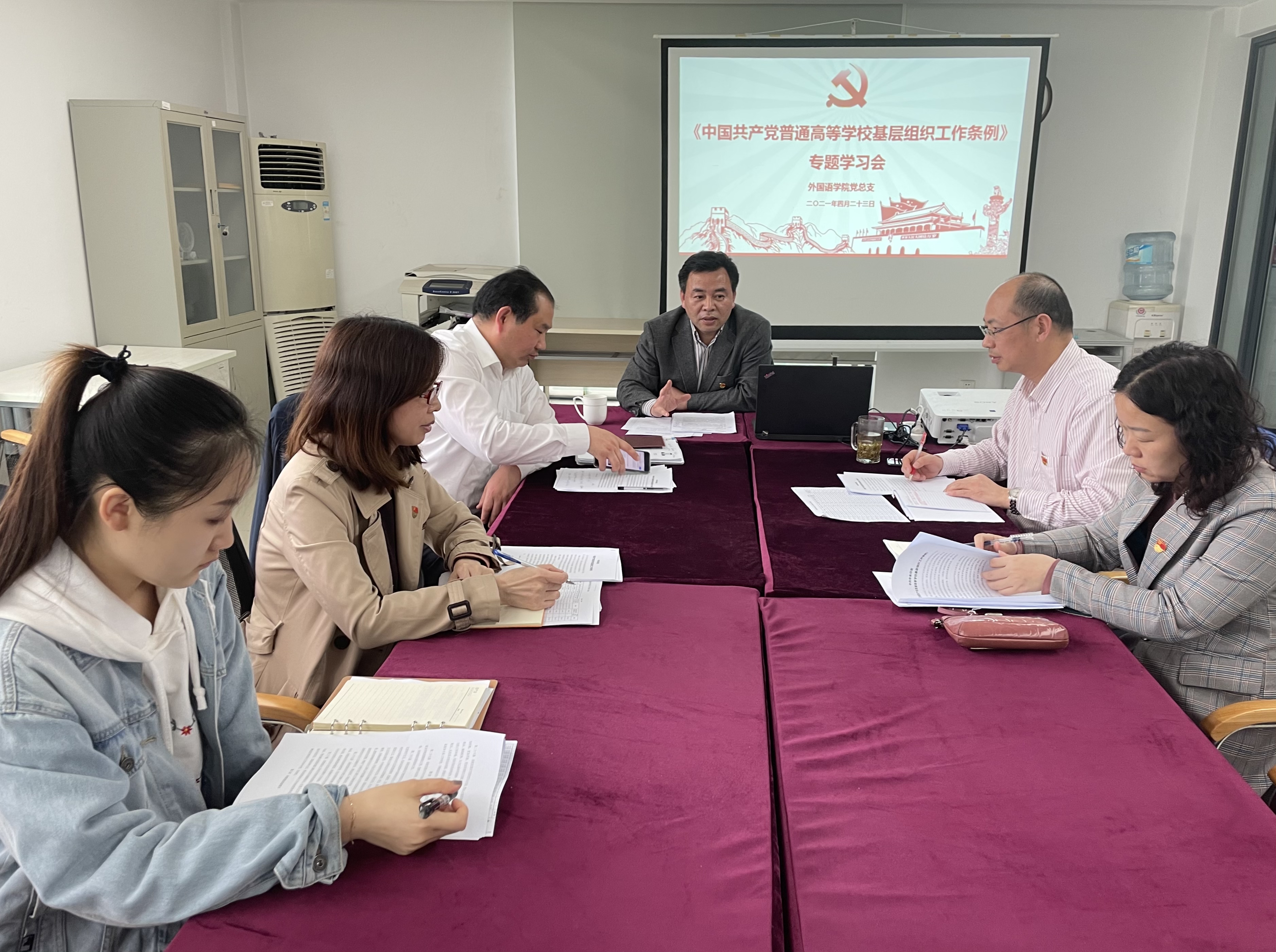4月23日下午,外国语学院党总支举行《中国共产党普通高等学校基层组织工作条例》专题学习会,学习会由党总支书记顾德华同志主持,全体总支委员及有关同志参加。